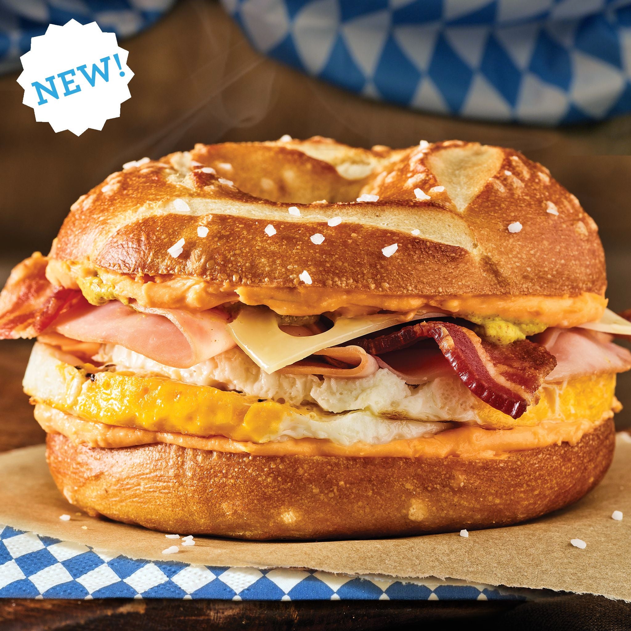 Oktoberfest starts at sunrise! Cage-free eggs with ham, bacon, Swiss cheese and Beer Cheese Shmear with a drizzle of mustard on a fresh-baked Pretzel Bagel. Limited time – while Oktoberfest lasts.
